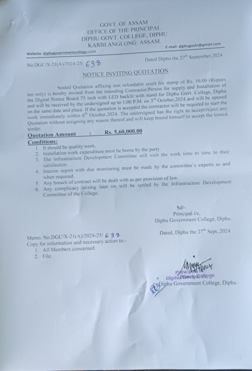 Diphu Government College is the only NAAC accredited higher educational institution in Karbi Anglong District of Assam. It was due to the pioneering efforts and visions of Lt. Chatra Sing Teron, Lt. Sai Sai Terang, Lt. Jogendra Nath Goswami, Lt. Dhoniram Rongpi, Lt. Joysing Doloi, Lt. Sar Rongpi and Lt. Padma Kanta Barua, that the college came to be formally inaugurated on 23rd June,1964. The College being a venture Arts College and beginning with only seven students and five teachers was taken over by the Government of Assam in the year 1967. A lot of combined creative efforts had been put together by its noble founders along with the founder Principal P.K. Bhuyan and the student leaders in converting the college into a Government College. The Science and Commerce streams were introduced in the college in the years 1979 and 1987 respectively. The College campus is located on a hillock of the District head quarter, Diphu.
